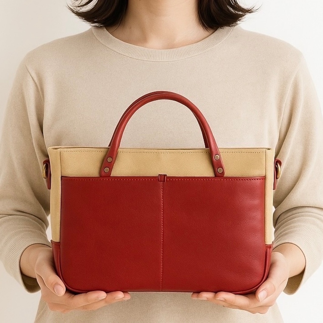 牛革と帆布を使用した、小さ目サイズのトートバッグです。