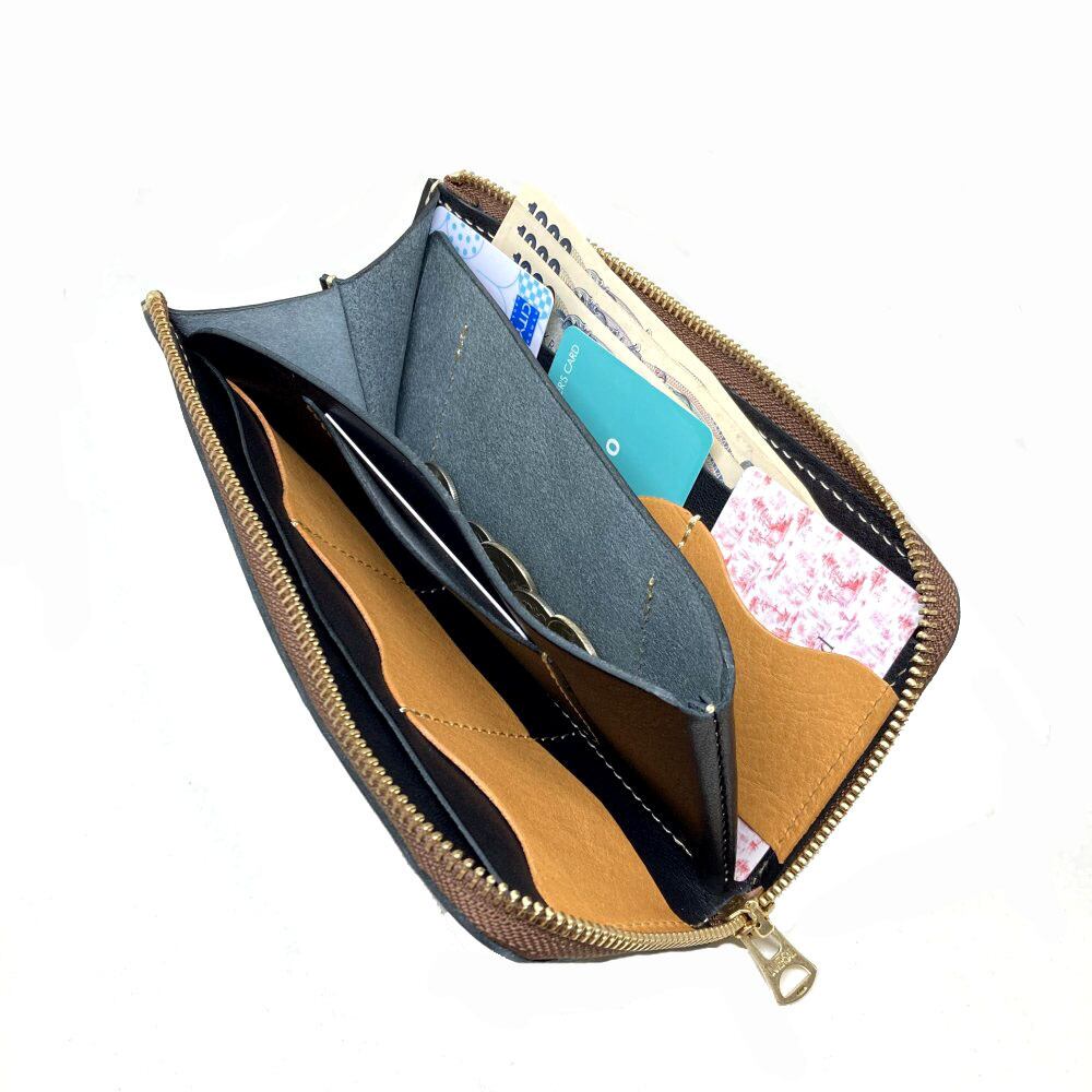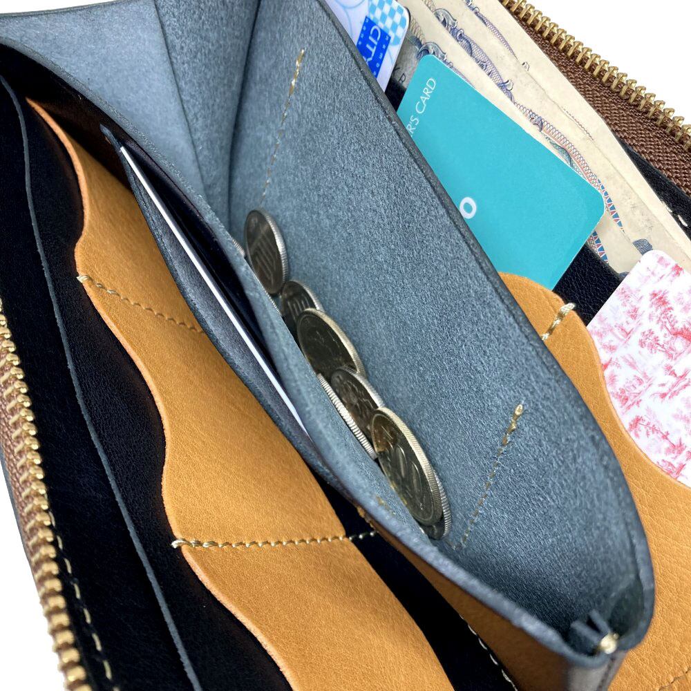 小銭入れはファスナーが付いておらず、マチ巾を広めにとることで大きく開き、小銭だけでなく、レシートや領収書を入れていただくことも出来ます。